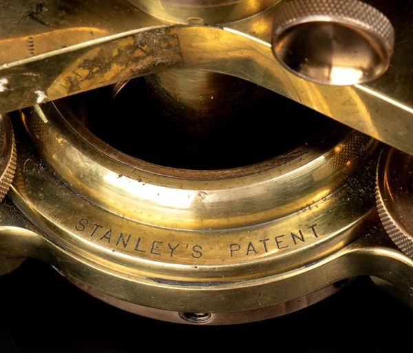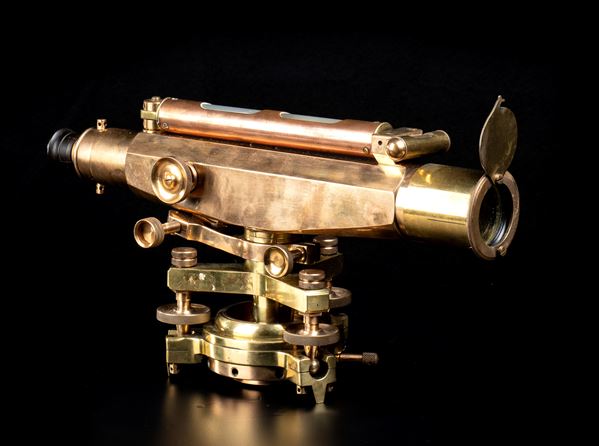 Surveying instrument, surveyor's theodolite / level, in turned brass, code 30420. First half of the 20th century, NEW ELTHAM LONDON, revision dated 1967. Wooden box with carrying strap