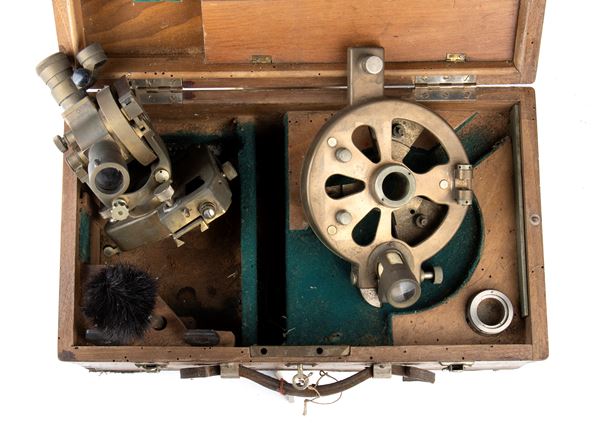 Militia Artillery Against Aircraft, Royal Air Force, circa 1940. 120ยฐ angled telescope theodolite, equipped with a precision compass associated with a toric level, horizontal and vertical circles, equipped with microscopes for reading the graduated vernier. A small knob allows you to rotate the vertical vernier, here too there is and associated with a small toric level with small steps provided with a mirror. Good condition, slight signs of wear and tear.