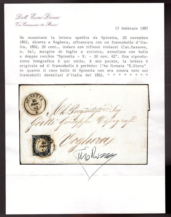 20.11.1862 - Letter from Spinetta to Voghera franked with a 20 cent. indigo n.2. On the postage the DC of ''SPINETTA'' (pt.R1). Cat. 16,500. (A) (Cert. Enzo Diena)