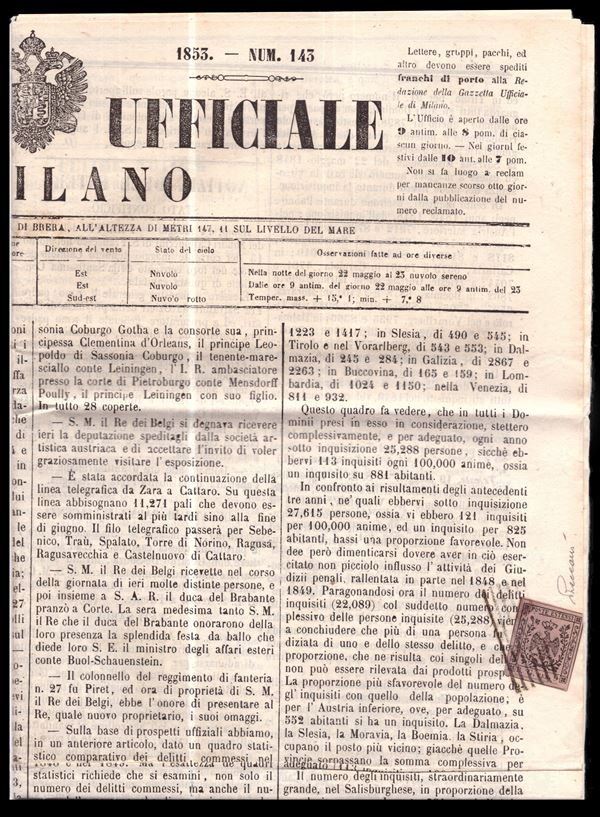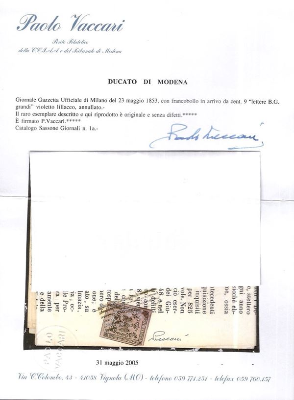 Modena, 9 cent. lilac violet ''BG grande'' n. 1 on the newspaper ''Gazzetta Ufficiale Milano'' of 23 May 1853. Cat.21,000. (A) (Vaccari Certificate)