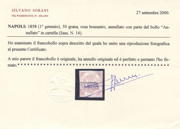 1858 - 50 gr. brownish pink n.14, used. Cat. 5,000. (A) (Cert. Sorani)