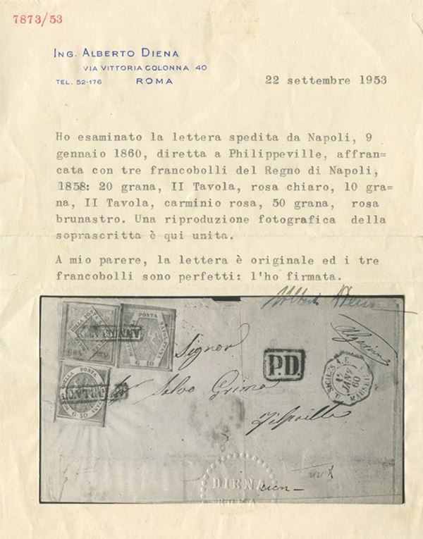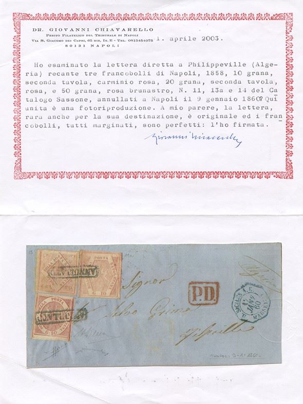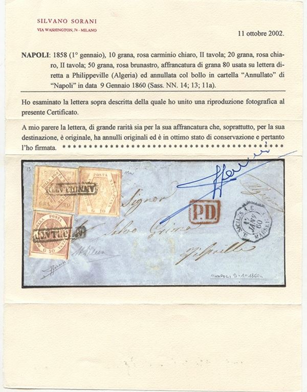 09.01.1860 - Extraordinary letter from Naples to Philippeville (Algeria) franked for 80 grana by means of a 10gr. light carmine pink n.11a + 20gr. light pink n.13 + 50gr. brownish pink n.14, all very well margined and in perfect condition. The choreographic franking together with the very rare destination make this letter probably unique, therefore it was rightly accompanied by three certificates. Cat. 73,500++. (LUX) (Cert. Chiavarello, Cert. Alberto Diena, Cert. Sorani)
