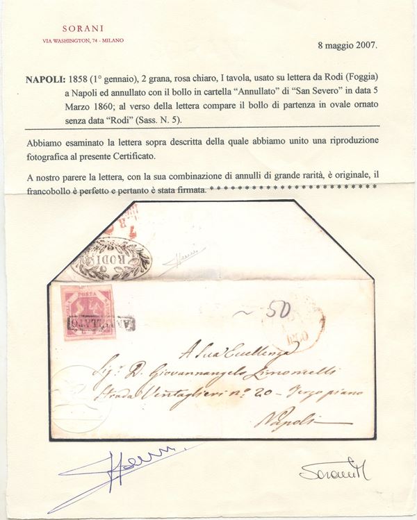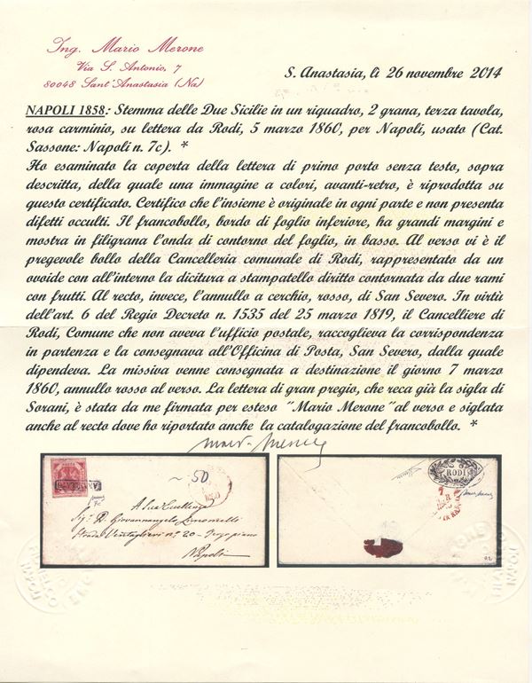 05.03.1860 - Letter from Rhodes to Naples franked with a 2gr. carmine pink n.7c. On the back is printed the very rare oval of RODI (pt.R2). Cat. 22,500++. (A+) (Cert. M. Merone, Cert. Sorani)