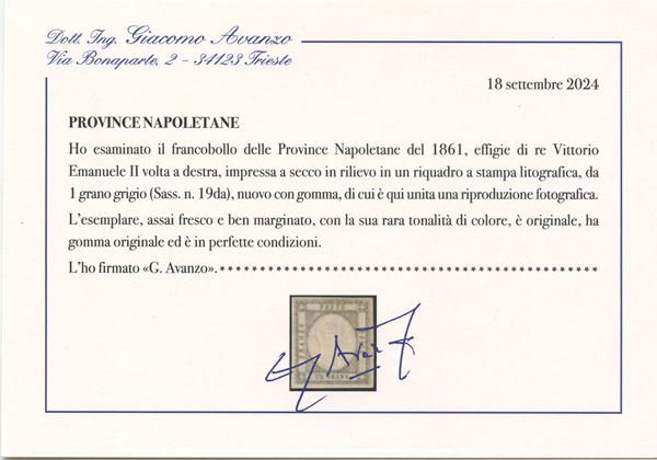 1861 - 1 gr. grey n.19 mint with original gum, MH. Very rare shade in mint condition, especially in this splendid state of preservation. Cat.16,000. (LUX) (Cert. G. Avanzo)