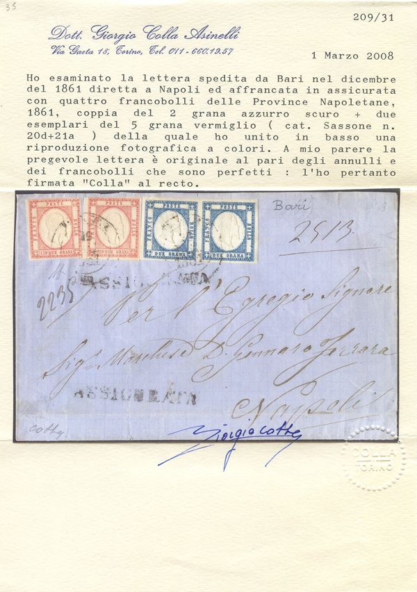 1861 - Insured sent from Bari to Naples and stamped for 14 grana by means of two values of 5 grana pink n.21e + a pair of 2 grana in a very interesting shade of color. On the letter the obverse block ''INSURANCED''. Uncommon set. Cat. 9,000++. (A+) (Cert. Colla, Alberto Diena, Tagliente)