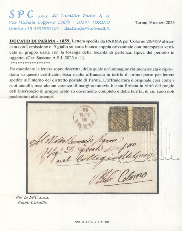 1859 - Letter from Parma to Colorno franked for 10 cents. (First postage rate for letters sent within the postal district) via a pair of 5 cent. yellow no. 1 with group space. Few other known examples of the pair with group space used in the rate for letters within the postal district. Cat. 35,000++. (B) (Cardillo Cert.)
