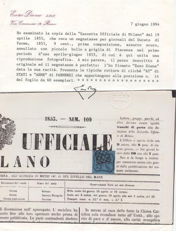 04.19.1853 - Newspaper ''Gazzetta Ufficiale di Milano'' franked with a dark blue 9 cent., first composition, n.2 on the 4th day of use. The set is further embellished by the constant defect ''A of Parmensi broken at the top and T of Stati cut'' characteristic, as attested by the two certificates, of pos. 14 of the sheet. Cat. 20,000. (A-) (Cert. Enzo Diena, Cert. Moscadelli)