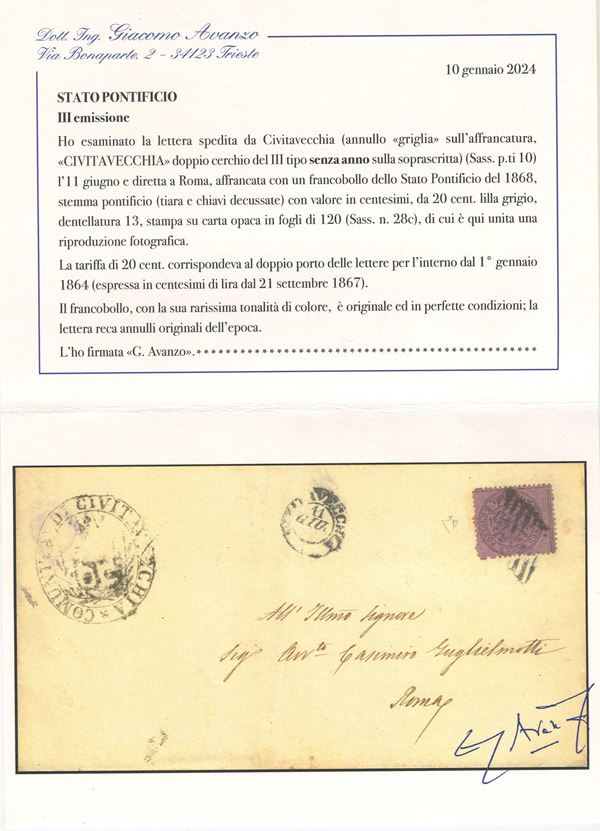 1868 - Envelope sent from Civitavecchia to Rome franked with a 20 cent. lilac grey n. 28c. The "grid" cancellation was used on the postage while the double circle of Civitavecchia was printed on the letter without indication of the year (10pt.) Very rare set. Cat. 24,350. (A+) (Cert. Giacomo Avanzo, En. Diena)
