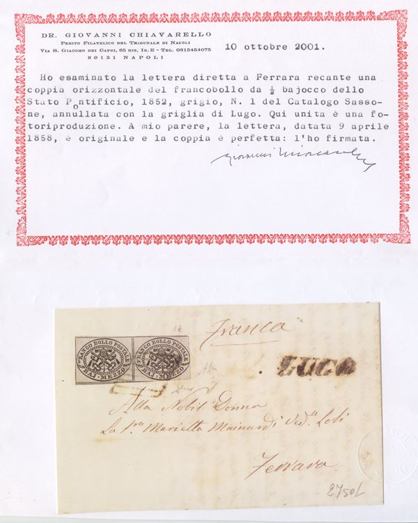 10.04.1856 - letter from Lugo to Ferrara franked for 1baj via a pair of 1/2 baj. grey n.1. Cat. 2,500++. (A) (Alberto Diena, Chiavarello Certificate)
