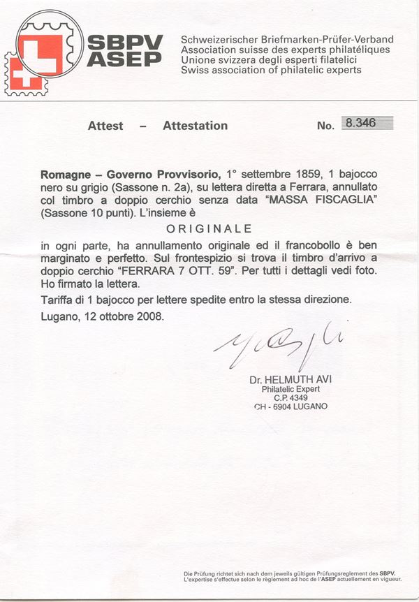 07.10.1859 - Letter from Massa Fiscaglia to Ferrara and franked with 1 Baj. grigio n.2a. On the franking the double circle of MASSA FISCAGLIA (10pt.) (A) (Cert. H. Avi)