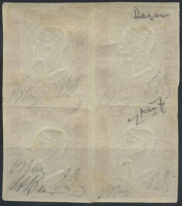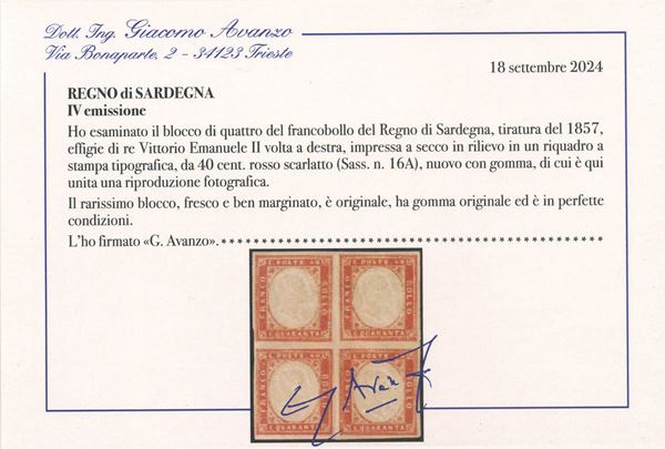 1857 - 40 cent. Scarlet n.16A in a splendid block of four mint with original gum, MH. Very rare. cat. 30,000++. (A) (Cert. Giacomo Avanzo, Alberto Diena in full, Emilio Diena, Oliva)