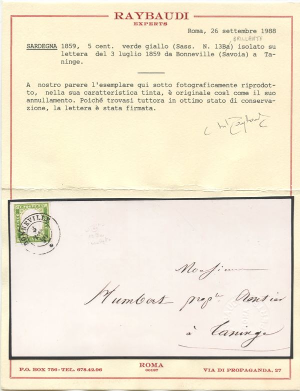 3.7.1859 - Letter from Bonneville to Taninge franked with a 5c. Green Yellow Brilliant 13B. Rate for letters forwarded within the postal district. Cat. 3,600. (A+) (Cert.Raybaudi).