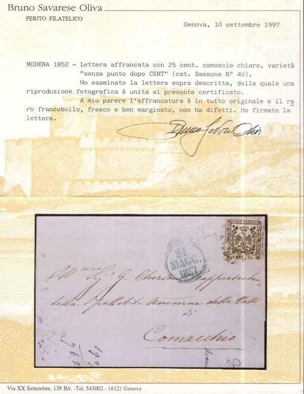 05.24.1857 - 25 Cent. Light Chamois without dot after ''CENT'' n.4d isolated on cover from Reggio to Comacchio. Cat. 10,000. (A+) (Emilio Diena in full, Cert. Oliva).