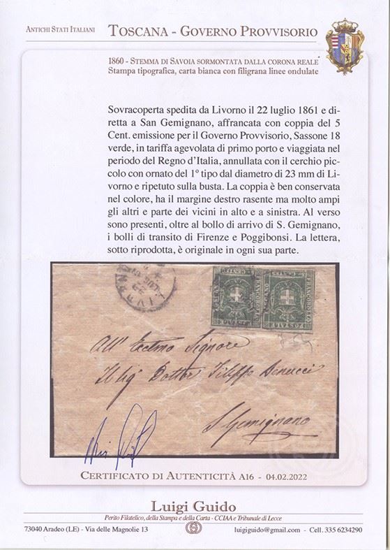 22.7.1861 - Letter from Livorno to S. Gemignano franked for 10c. via a pair of 5c. Green N.18 of the Provisional Government of Tuscany circulated during the Kingdom of Italy. Cat. 2,700++. (A) (Cert. Luigi Guido)