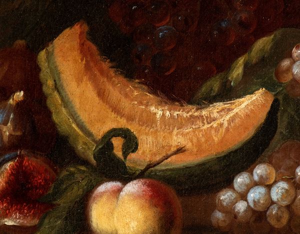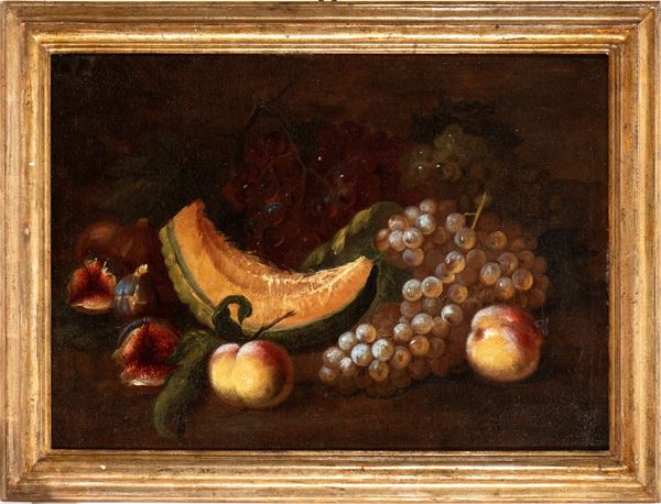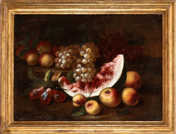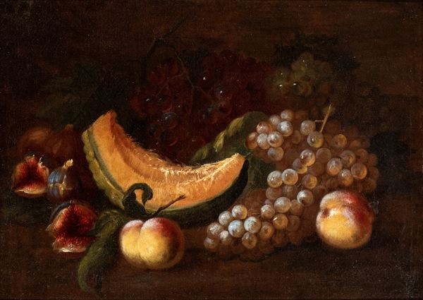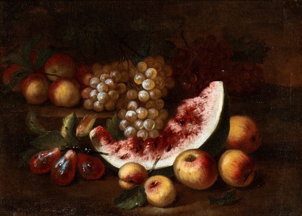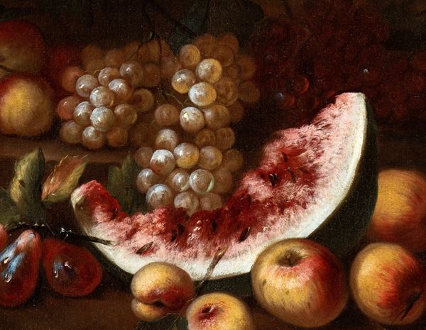 a) Still life of melon, figs, grapes and peaches; b) Still life of watermelon, apples, grapes and pears. Pair of paintings