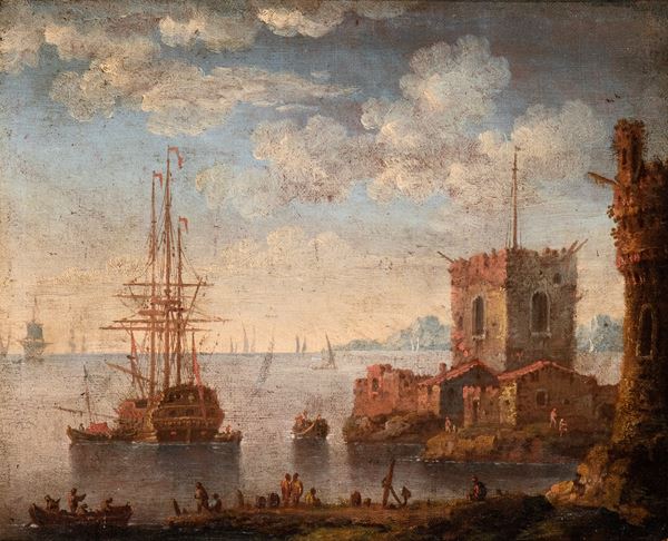 a) Marina with vessel, buildings and figures; b) Marina with vessel ruins and figures. Pair of paintings