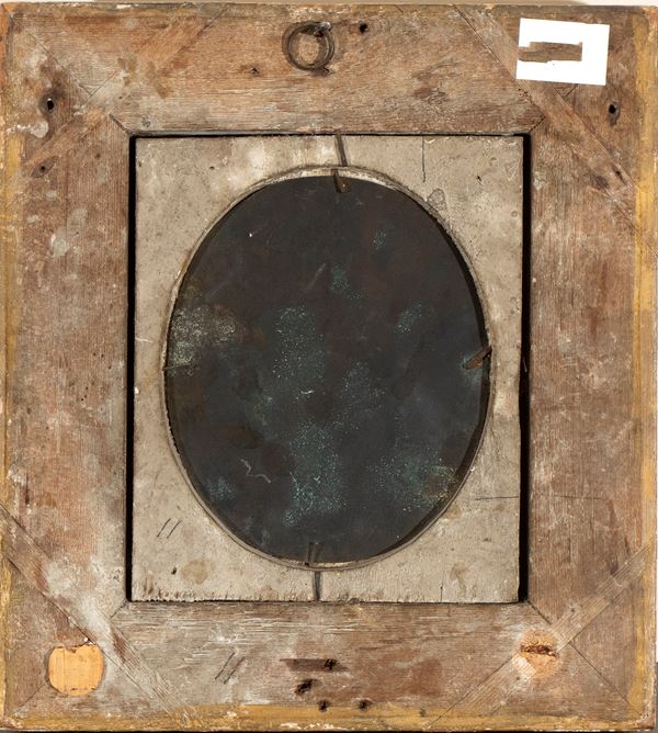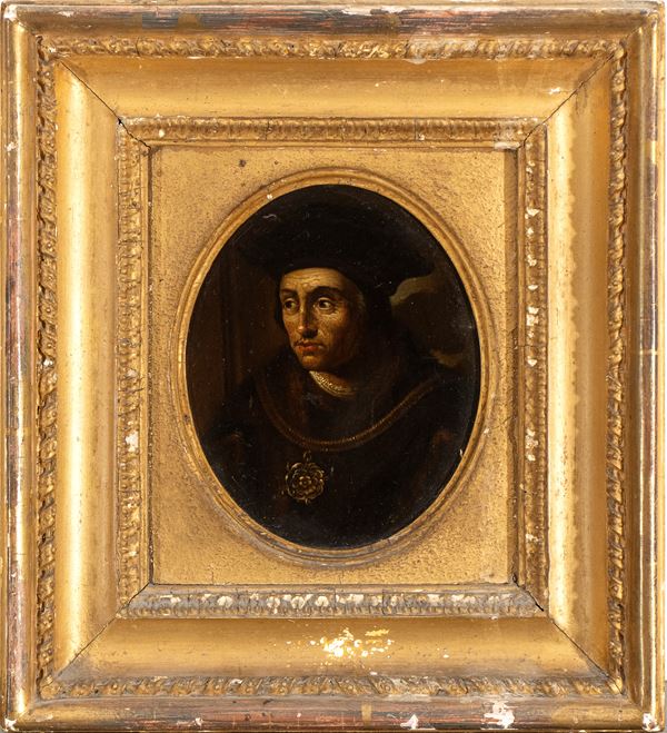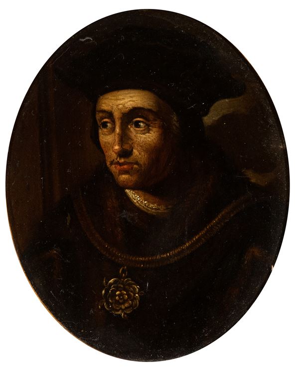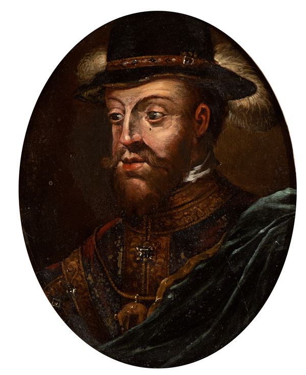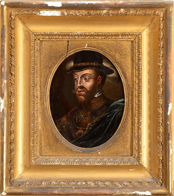 a) Manly portrait with hat and feather; b) Manly portrait with hat, necklace and medallion. Pair of paintings