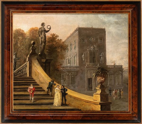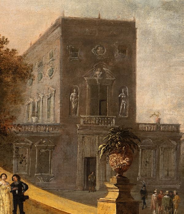 Dopo la prima formazione nella nativa Strasburgo presso la bottega di Friedrich Brentel, Johann Wilhelm Baur si trasferì in Italia nel 1631, dapprima a Napoli e poi a Roma, dove secondo Sandrart soggiornò dal 1634 al 1637. A Roma Baur elaborò il suo raffinato stile di paesaggista e vedutista con una complessa e ben studiata combinazione di elementi derivati fedelmente da un luogo rappresentato ed elementi di fantasia, che in qualche caso assumono importanza pari quando non addirittura superiore a quelli realistici. Negli anni romani Baur fu particolarmente attratto dalle ville suburbane dell’aristocrazia capitolina, soprattutto Villa Borghese, con la loro peculiare armonia di sontuose architetture, eleganti giardini, fontane e sculture.  Nel mirabile dipinto che qui si presenta Baur libera felicemente la sua fantasia combinatoria. A prima vista a scena si direbbe ambientata, sia pur con qualche licenza, a Villa Doria Pamphilj, col Casino del Bel Respiro di Algardi sullo sfondo e in primo piano l’elegante rampa ad esso retrostante, dominata dalla grande scultura muliebre. Tale ipotesi è stata però revocata in dubbio da Carla Benocci giacché negli anni in cui le fonti attestano Baur a Roma, 1633-1637, non era stato ancora avviato il rinnovamento dell’antica proprietà pamphiliana sulla via Aurelia. È opportuno nondimeno rilevare che la scultura della figura femminile con ghirlanda è tuttora presente nella Villa. Il tema del casino con ponte e terrazze, introdotto da una scalinata laterale con arredi scultorei, fu in ogni modo particolarmente caro all’artista e si può rinvenire in varie altre sue opere.  Come sintetizza felicemente Carla Benocci: “Baur rappresenta un importante anello di congiunzione tra la raffigurazione di giardini formali (…) e l’immagine dei successivi giardini paesistici, che l’artista interpreta osservando particolari scorci di ville dell’area romana, raffigurati in composizioni ricche di pathos, talvolta con qualche aggiunta fantastica”.