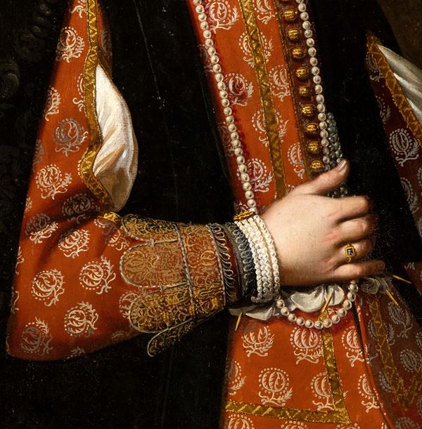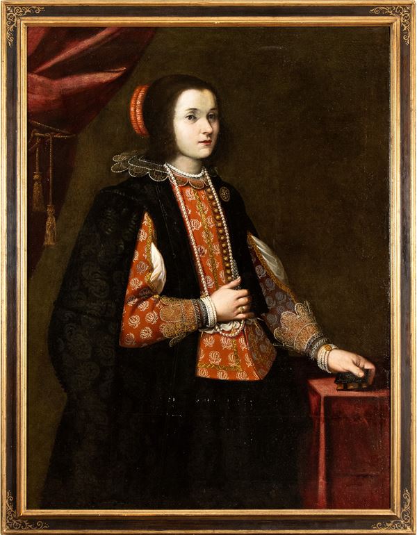 The protagonist can be identified with certainty as Olimpia della Ciaja (1614-1640), Augusto Chigi's first wife, thanks to the portrait, also attributed to Giovanni Maria Morandi, now in the Museo del Barocco Romano in the Palazzo Chigi in Ariccia, which is part of a series of paintings probably commissioned to the artist by Agostino I Chigi.