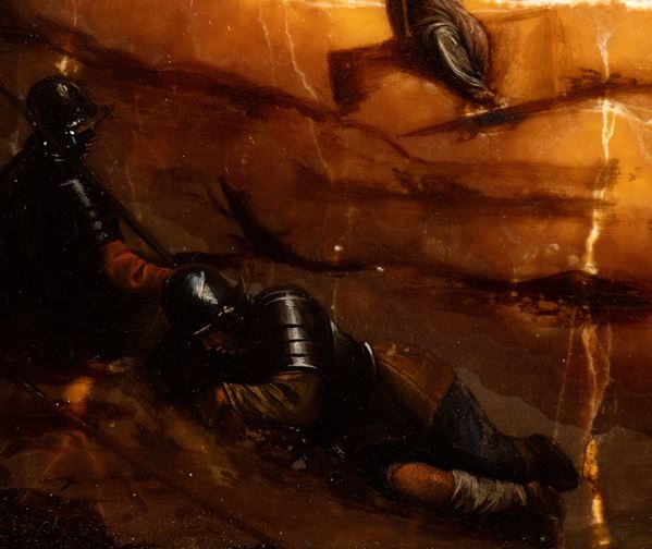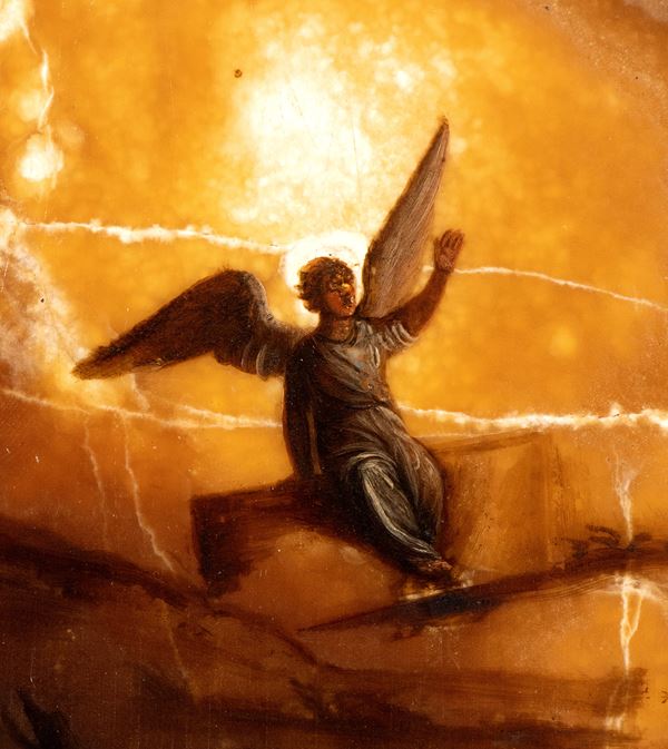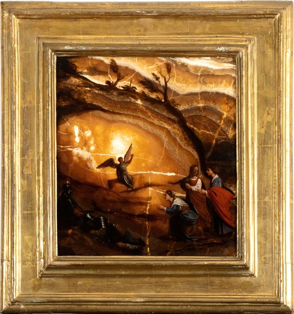 La moda per la pittura eseguita su pietre e marmi policromi prese piede a Roma negli ultimi decenni del Cinquecento, coinvolgendo anche artisti di primissimo piano come il Cavalier d’Arpino, e si diffuse ben presto in molti ambienti artistici italiani ed europei, a partire da Firenze. Figura cardinale nel processo di affermazione di questo nuovo genere, a mezza via tra pittura, arte suntuaria e oggettistica di alto arredo, fu il fiorentino Antonio Tempesta (1555-1630) che ne eseguì un gran numero per alcune delle più prestigiose committenze capitoline. Gli specialisti di questo genere furono impegnati a sfruttare virtuosisticamente le peculiarità coloristiche e le movimentate linee degli strati sedimentari dei supporti lapidei impiegati: fra questi, l’alabatro (così come l’alberese, la cosiddetta pietra paesina) si prestò particolarmente a delineare gli sfondi paesaggistici degli episodi raffigurati. Ne fornisce una mirabile esemplificazione l’esemplare qui in oggetto, che raffigura con grande chiarezza narrativa il momento in cui le tre Marie si recano al sepolcro di Cristo con olii e balsami per lavarne il corpo, trovandolo però vuoto mentre un angelo le informa dell'avvenuta resurrezione. Il nostro dipinto sfrutta appieno le gamme brunite, ma accese e contrastate, del supporto per ambientare la scena in un'atmosfera serotina e sin quasi notturna e testimonia del diffuso impiego dei supporti di pietra anche per dipinti di destinazione devozionale. Merita di essere rilevata la vicinanza con l’arte di Antonio Tempesta, come suggerisce il confronto con opere come il Battesimo di Cristo, passato in asta da Il Ponte a Milano il 22 ottobre 2015 (l. 1040) o la Conversione di San Paolo della collezione Giulini a Milano.
