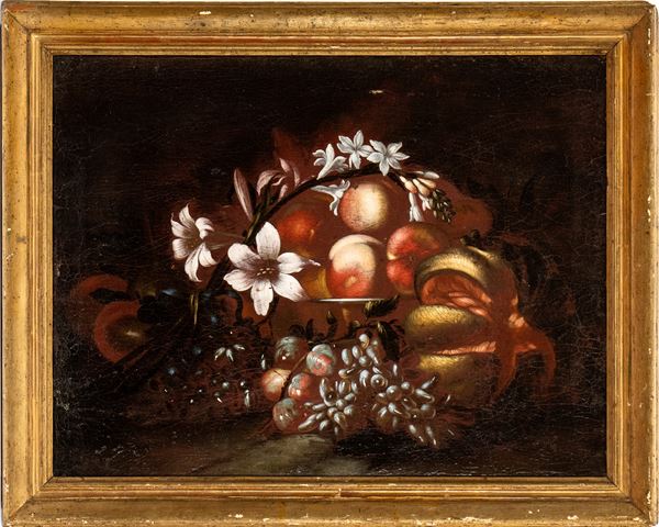 a) Still life of fruit with roses and jasmine; b) Still life of fruit with lily. Pair of paintings