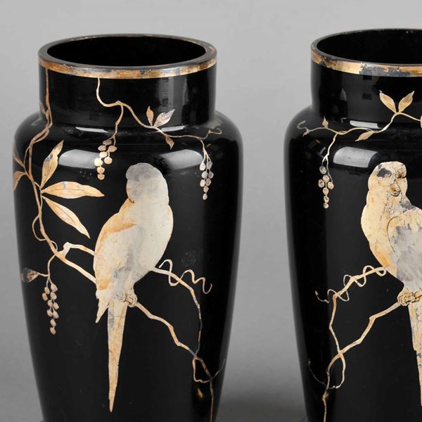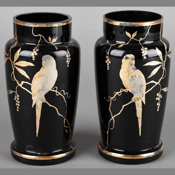 Pair of Art Deco vases in black glass with flared support with high cylindrical wall, slightly retracted neck, rim decorated in gold.