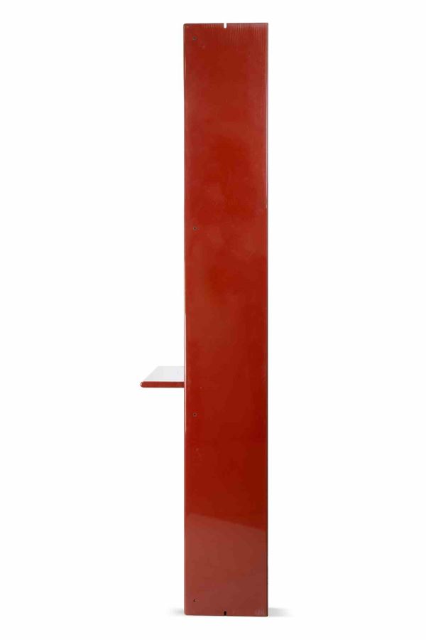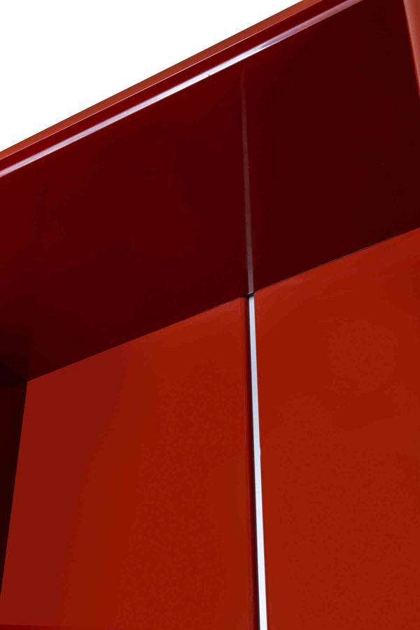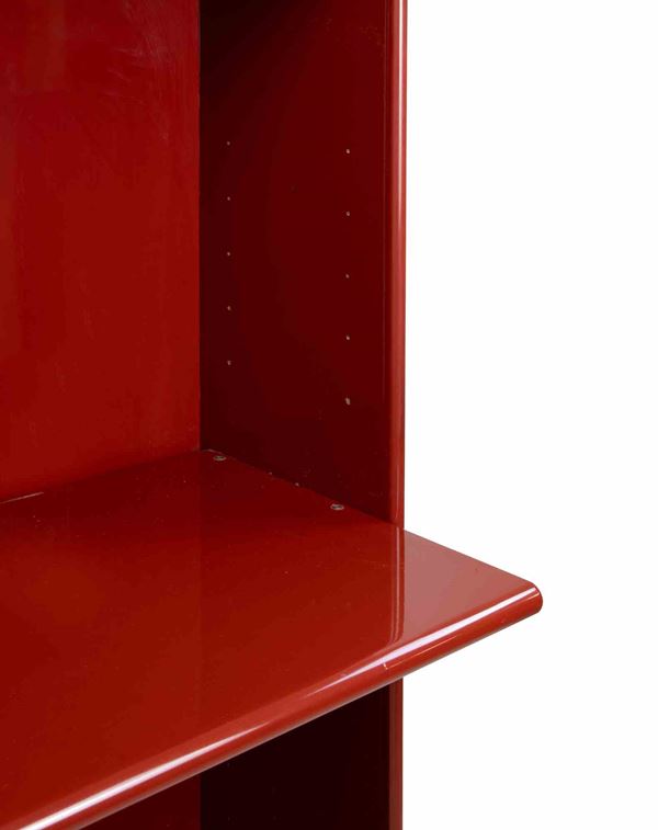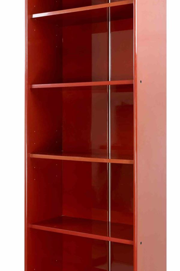 Vintage 4 Modules 'Olinto" Bookshelf by Kazuhide Takahama for B&B Italia, Italy 1970s.Lacquered Wood in "China Red", Metal and Glass.2 Modules with with Glass Doors.Each part: h 232,41 cm (91,5 in), l 67,31 cm (26,5 in) , d 33,02 cm (13 in).The color