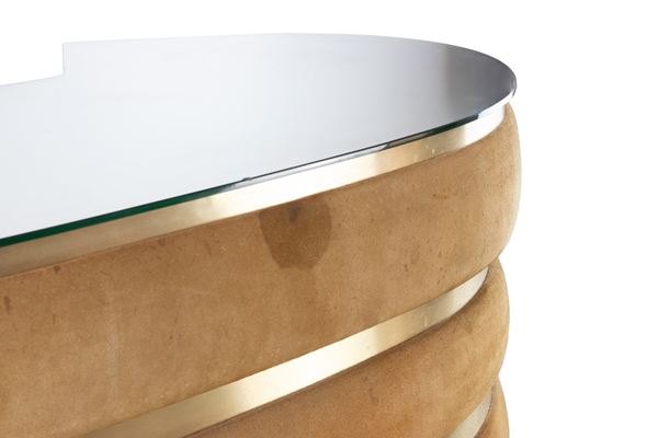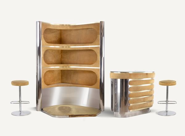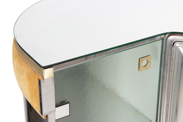 The set also includes: illuminated shelves, a counter with a mirrored glass top, chrome sides, a suede front panel and two stools with original suede seats.