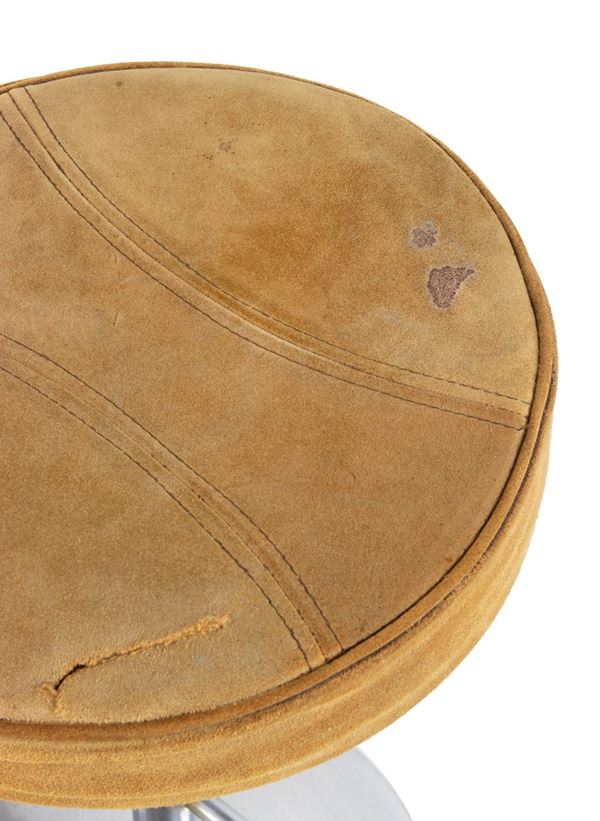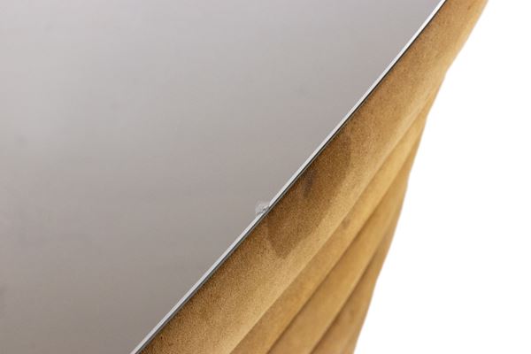 Very good condition except for a stain in the top stripe of the countertop's suede, a very minor chip in the countertop's glass and a rip in the suede of one of the stools.