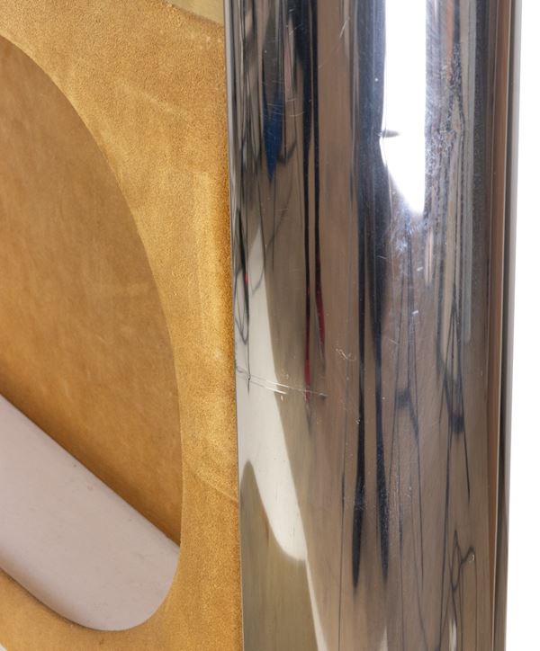 Rare and beautiful vintage dry bar designed by Willy Rizzo in the 1970s. Mustard suede, chromed metal bars.