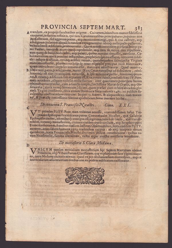 Etching, 242 x 170 mm (plate), 332 x 230 mm (sheet). Single state. From Francesco Gonzaga's "De Origine Seraphicae Religionis Franciscanae" of 1587. De Grazia 131/4