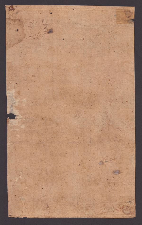 Fine impression printed on laid paper. Uniformly browned sheet, margins on three sides, lower margin trimmed. Lack at the bottom center, presence of various stains.