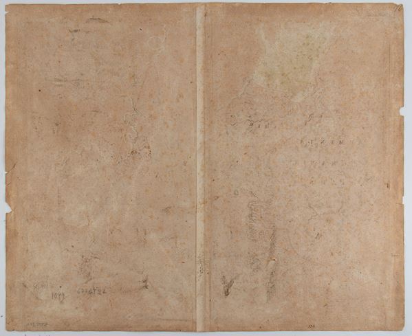 Map printed on laid paper with watermark. It has light browning, signs of foxing, tears and wear on the edges, as well as central folds. Otherwise in good condition.