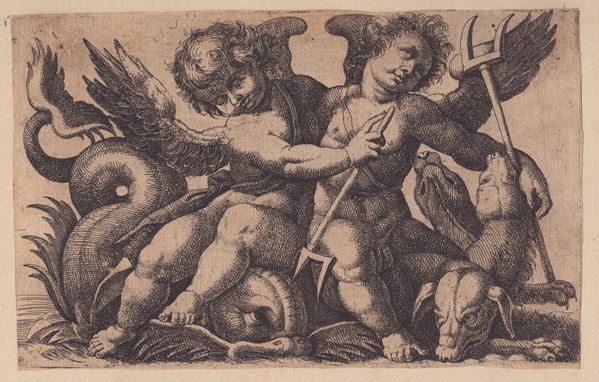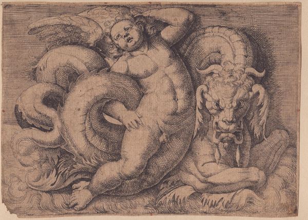 Putto with a Sea Serpent | Two Putti Riding a Sea Monster
