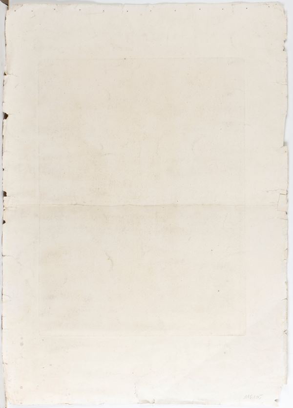 Fine impression on laid paper with watermark (BRACCIANO). Sheet with various tears along the edges, a central horizontal fold, binding holes at the top and a fold at the bottom left.