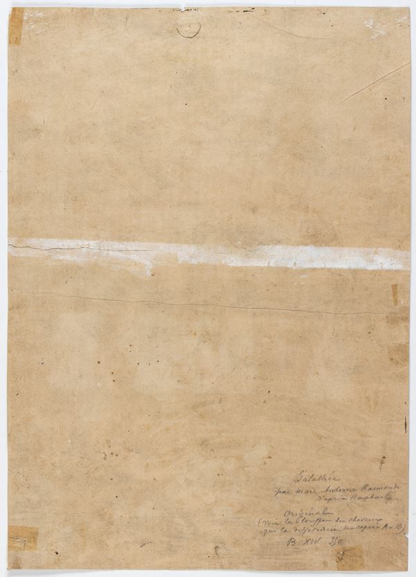 Slightly faded but still a fine impression, printed on laid paper without a watermark. Trimmed. Horizontal tear along the entire length of the sheet, restored, with some stains left by the restoration. Some holes and scratches present. Paper uniformly browned.