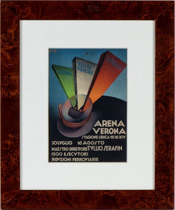 Color lithograph, 246 x 175 mm. Futurist poster with Verona Arena season's schedule on the back. Dry stamp of the Ferrovie del Stato
