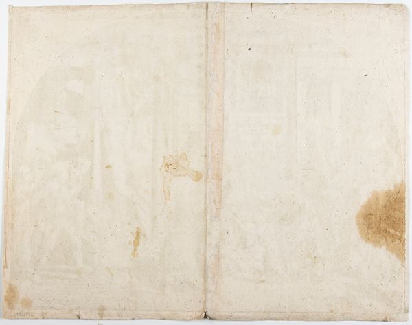 Sharp impression on laid paper with watermark. Usual vertical central fold. In good condition, except for stains and wear along the edges.