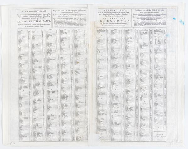 Map of Hainaut, province of Wallonia in Belgium. Fine impression on laid paper, with margins of about 1-2 cm. Nice contemporary coloring. On the verso, text in French and Dutch. Usual central fold. In very good condition, except for light creasing and a small hole in the lower left margin, closed on the verso.