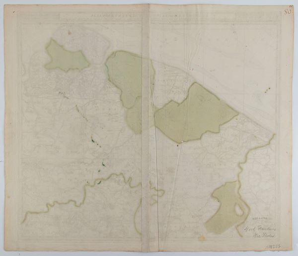 Etching and engraving, 530 x 625 mm. Map of West Flanders, with the cities of Brugge, Dixmuide, Nieuport, Ostend and Sluys.