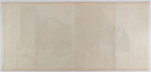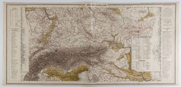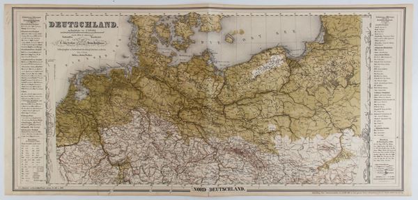 Map of Germany, printed on two sheets yet to be joined. Fine, lively impression on wove paper. Each sheet has 3 editorial vertical folds. In good condition, except for light uniform browning and small tears on the folds.