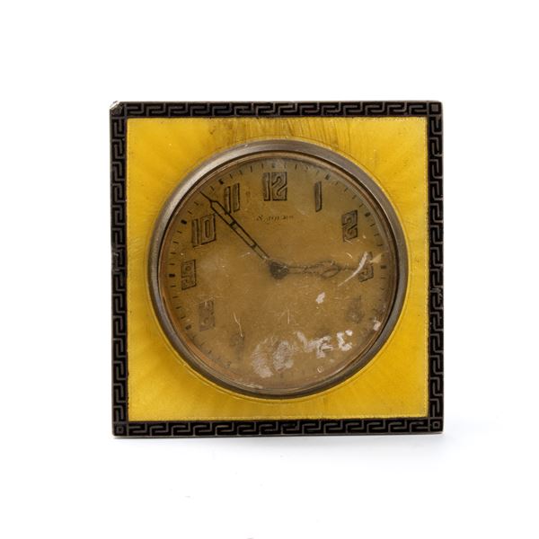 Metal case with guilloché enamels in shades of yellow with a black enamel perimeter frame, gold dial with Arabic numerals and luminescent hour markers. On the back of the case, the inscriptions "2 Two Adjustments - Six 6 Jewels - Schild & Co. - Swiss". A. Schild & Co., also known as ASSA, was founded in 1896 in Grenchen, Switzerland. The company was renowned for producing high-quality watch movements and became one of the major movement suppliers in the Swiss watch industry.