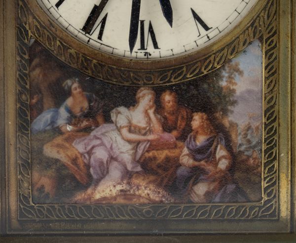 Carriage clock case with the lower part of the front painted in polychrome depicting a gallant scene. White enamel dial with Roman numerals and black hour markers, featuring the inscriptions "Lenzkirch - AGV".