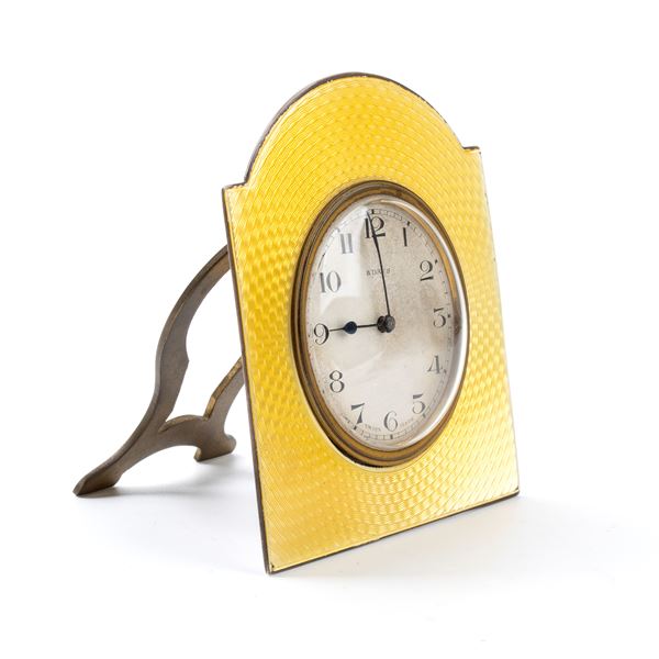 Sterling silver and yellow guilloché enamels case, silvered dial with Arabic numerals bearing the iscriptions '8 Days - Swiss made'.