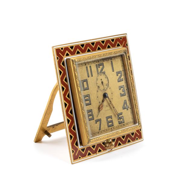 Gilded metal case with a geometric brown, black and red enamels frame. Gilded dial with Arabic numerals and luminescent hour markers bearing the inscription "LUGA" and subsidiary dials for the alarm and seconds. On the case back "29242 - 13JEWELS".