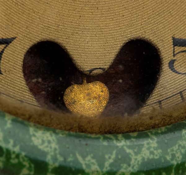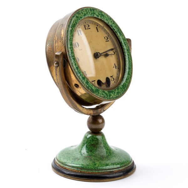 Gilded and green guilloché enamels case, round shape. Gilded dial with Arabic numerals, black hour marker and pendulum at 6 o'clock, bearing the iscription "R.M.S. Laconia".