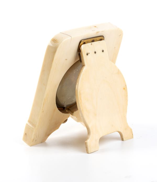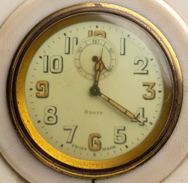 Rectangular shaped case with rounded head made of elephant ivory (Elephas maximus Linnaeus, 1758 or Loxodonta africana Blumenbach, 1797); brass watch with white enamel dial, Arabic numerals and luminescent spheres with inscription '8 Days'.
