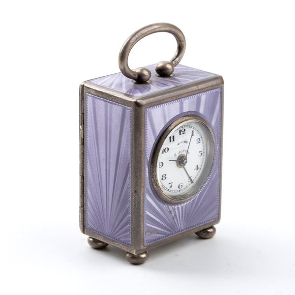Carriage clock case in sterling silver with guilloché enamels in shades of purple; white enamel dial with Arabic numerals and black hour markers, featuring the inscription "8 Jours". The watch is key wound and set.