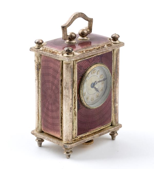 Carriage clock case in 800/1000 silver with guilloché enamels in shades of plum, gold dial with Roman numerals within gold bezels with golden Arabic numerals and black hour markers. The watch is key wound and set.