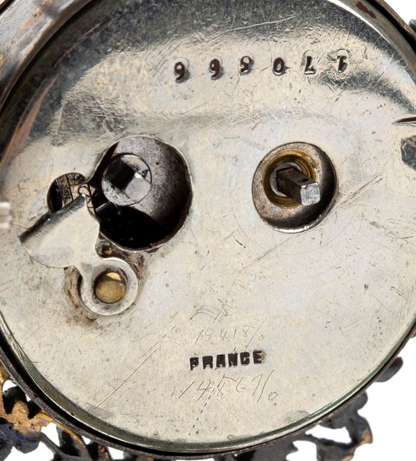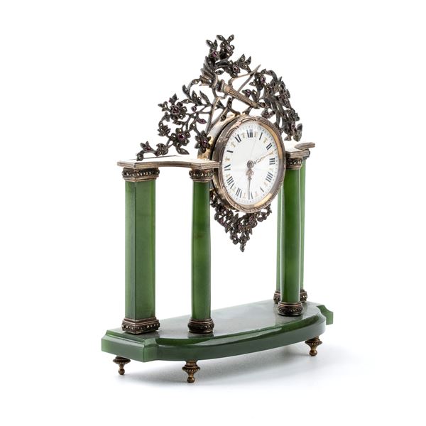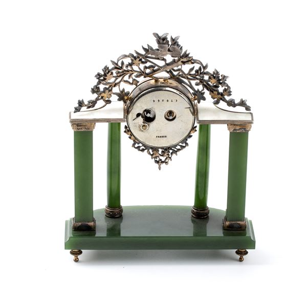 Temple-shaped case with a jade base and columns, silver top with floral motifs, an arch and arrows set with marcasites and colored stones; the watch case in silver, white enamel dial with Roman numerals and gilded hour markers. On the back of the case "2170566 - FRANCE". The watch is key wound and set.